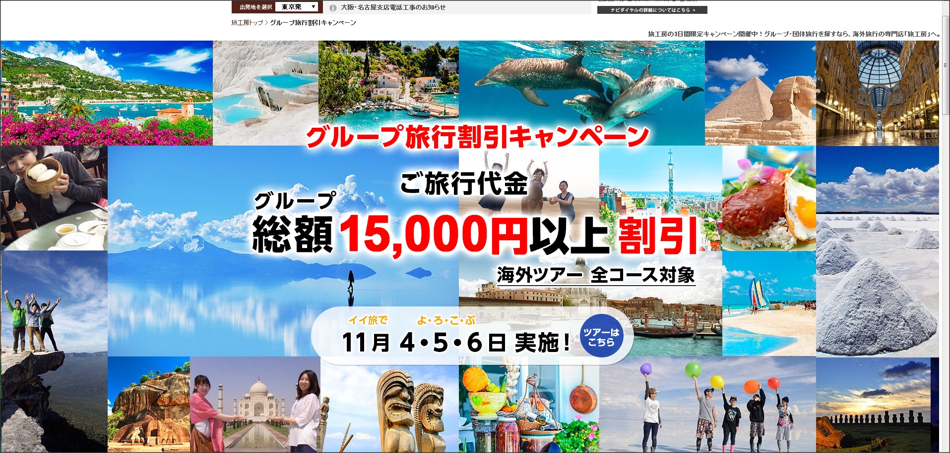 旅工房 14万件の全ての海外旅行商品が対象 3名以上のお申し込みで1人5 000円キャッシュバックするグループ割引 11月 イイ旅で 4 5 6日 よろこぶ キャンペーン 株式会社 旅工房のプレスリリース